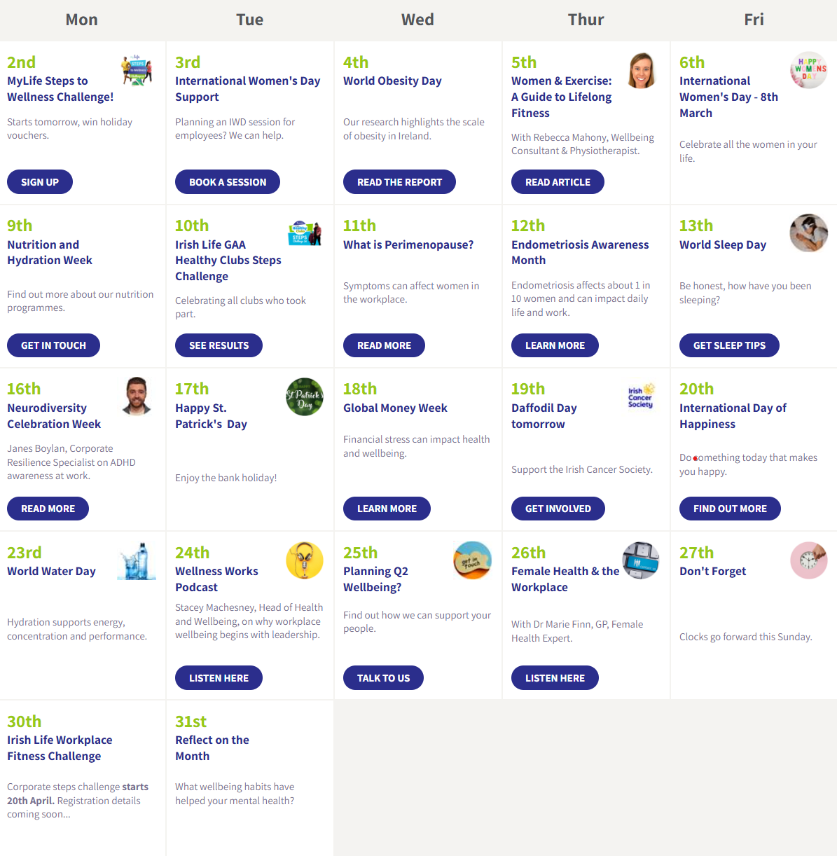 Wellbeing CalendarAs we prepare to celebrate International Women's Day, our March Wellbeing Calendar theme is dedicated to female health and wellbeing. In the calendar below, we cover crucial topics in this space including endometriosis and perimenopause. Click below to explore more. | ||||||