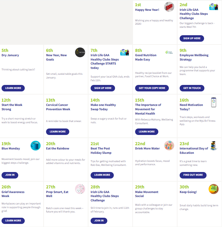 Wellbeing CalendarHappy New Year, this January, we're getting back to basics with a focus on fitness and nutrition to help you start 2026 feeling energised and motivated. Key highlights this month include our Irish Life Healthy Clubs Steps Challenge and our Employee Wellbeing Strategy. Click below to explore the full calendar. | |